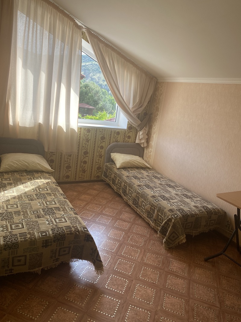 Прекрасный номер для семьи с детьми. В номере: кровати, шкаф, с/у, кондиционер, ТВ, стол и стулья. Красивая винтовая лестница ведет на уютный, обшитый деревом, второй этаж, из окон которого открывается замечательный вид на горы.