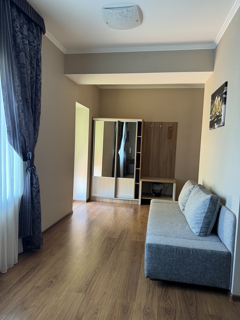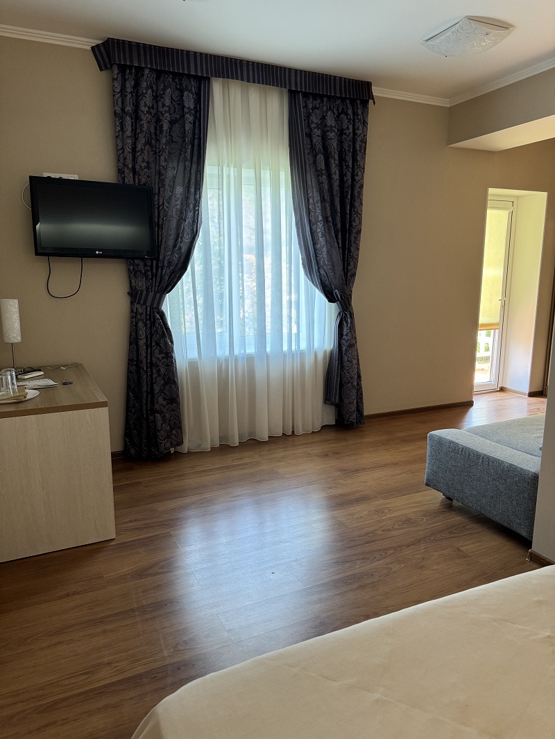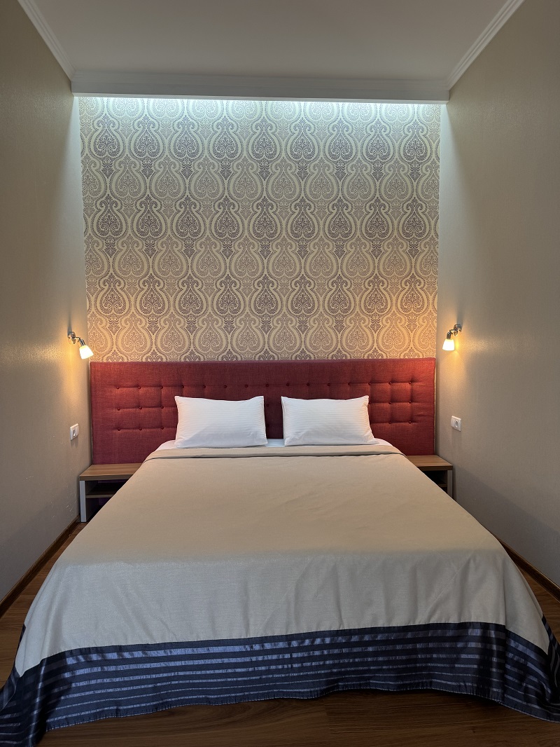 В номере просторная двуспальная кровать и диван, который можно использовать как дополнительное спальное место.